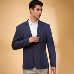 Navy blue solid regular-fit casual blazer, long sleeves, single-breasted with double button closure, two flap pockets, one welt pocket and a double-vented back hem